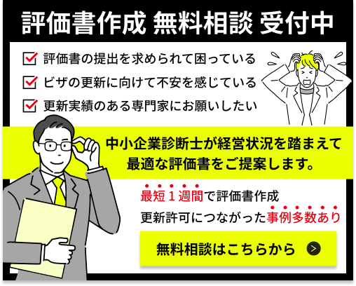 “経営改善の見通し評価書”は、改善の可能性を、具体的な計画とともにその実現が妥当であると第三者の専門家によって評価されるため、ビザ更新の審査をクリアするための重要な証拠書類となります。