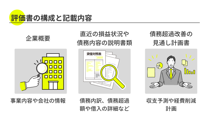 この評価書は、企業が債務超過の状態に陥った場合、その問題への具体的な改善策や経営計画の実現可能性を評価するためのものです。