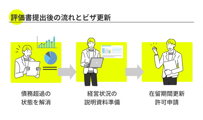 特に、債務超過のままではビザの更新が難しいため、改善の見通しを第三者が客観的に評価し、その結果を文書化することが求められます。